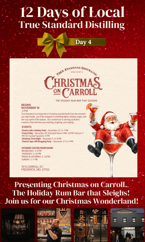 New this year, they’re offering a limited-edition Carroll Street Cider Gift Set, a ready-to-prep apple cider rum blend that makes the perfect Frederick-made holiday gift. Stop in starting November 19 to enjoy their Holly Jolly Housewives special: $2 off any bottle, and experience why True Standard Distilling has become one of Frederick’s most spirited local treasures.