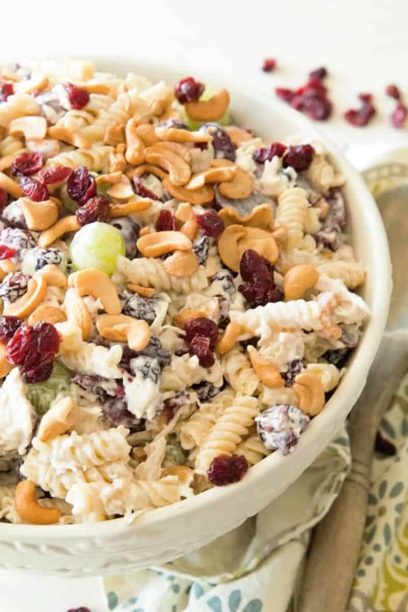 Julie with Julie’s Eats & Treats loads this salad with cashews, grapes, chicken (or turkey), pasta and dried cranberries.