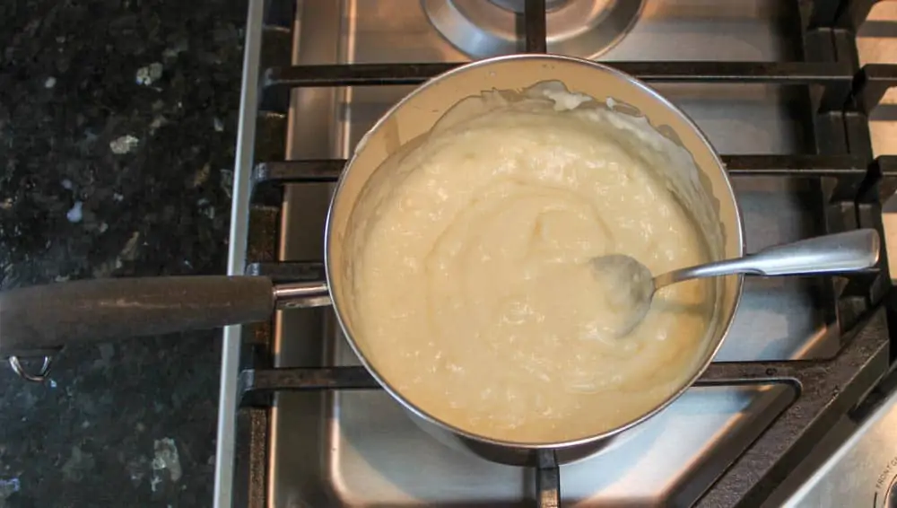- Add butter, flour, and milk to a sauce pan and heat over medium heat, while stirring, until it's well blended and thickens. Allow to cool slightly.